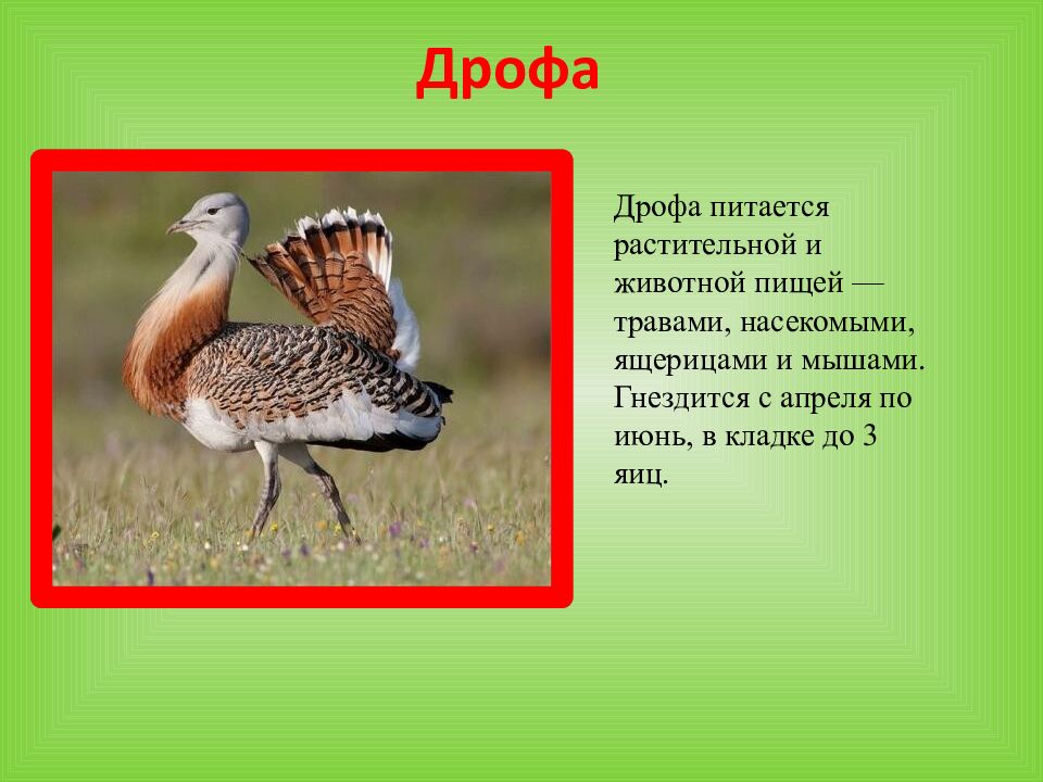 Дрофа питается растительной и животной пищей — травами, насекомыми, ящерицами и мышами. Гнездится с апреля по июнь, в кладке до 3 яиц.