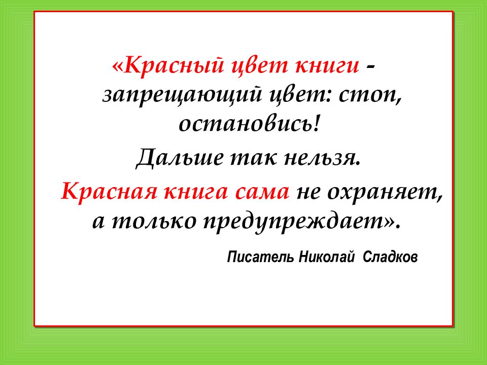« Красный цвет книги - запрещающий цвет: стоп, остановись! Дальше так нельзя. Красная книга сама не охраняет, а только предупреждает». Писатель Николай Сладков