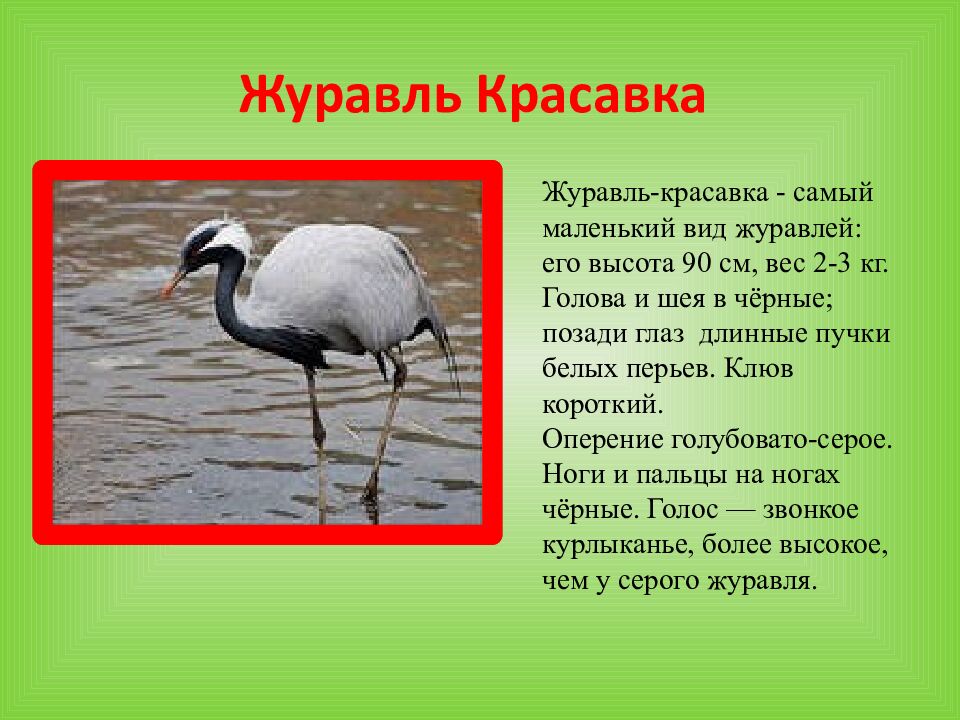 Журавль-красавка - самый маленький вид журавлей: его высота 90 см, вес 2-3 кг. Голова и шея в чёрные; позади глаз длинные пучки белых перьев. Клюв короткий. Оперение голубовато-серое. Ноги и пальцы на ногах чёрные. Голос — звонкое курлыканье, более высокое, чем у серого журавля.