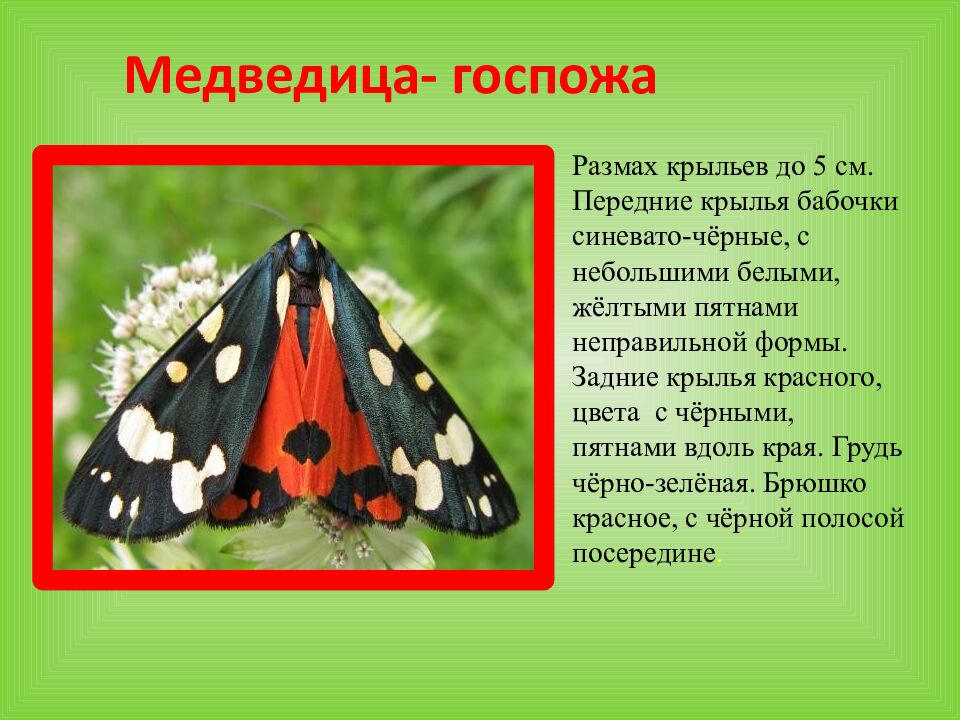 Размах крыльев до 5 см. Передние крылья бабочки синевато-чёрные, с небольшими белыми, жёлтыми пятнами неправильной формы. Задние крылья красного, цвета с чёрными, пятнами вдоль края. Грудь чёрно-зелёная. Брюшко красное, с чёрной полосой посередине.