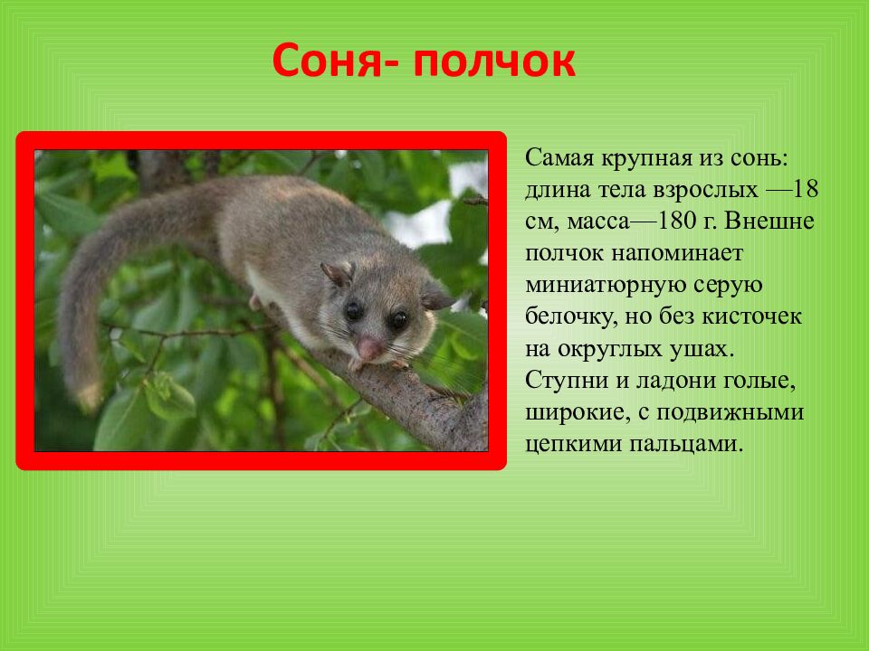 Самая крупная из сонь: длина тела взрослых —18 см, масса—180 г. Внешне полчок напоминает миниатюрную серую белочку, но без кисточек на округлых ушах. Ступни и ладони голые, широкие, с подвижными цепкими пальцами.