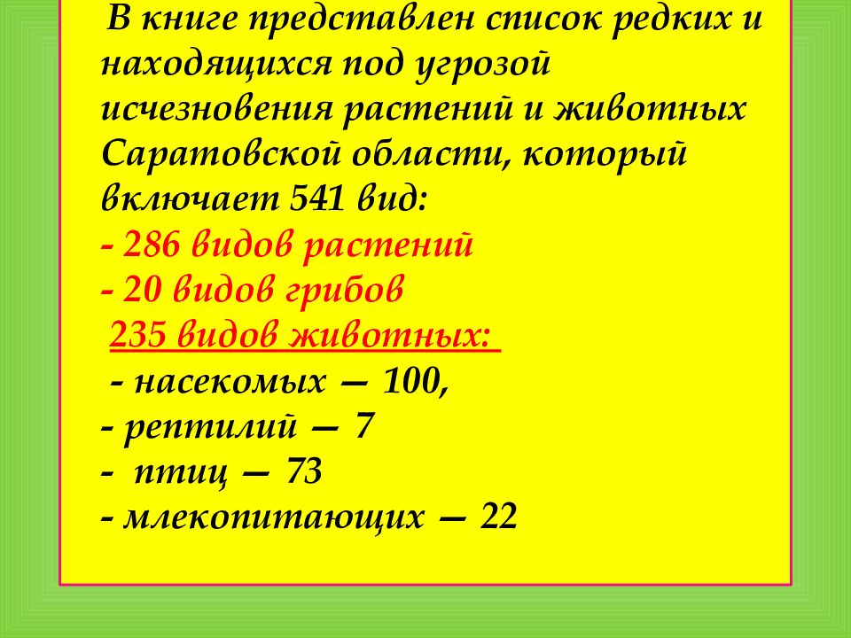 В книге представлен список редких и находящихся под угрозой исчезновения растений и животных Саратовской области, который включает 541 вид: - 286 видов растений - 20 видов грибов 235 видов животных: - насекомых — 100, - рептилий — 7 - птиц — 73 - млекопитающих — 22