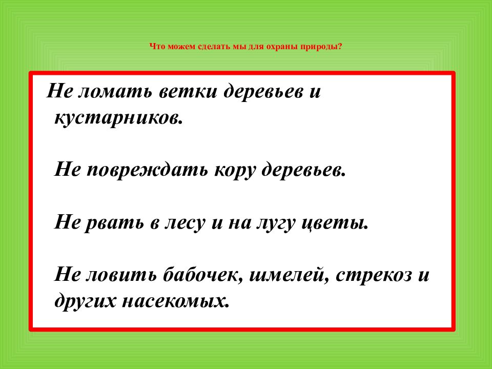 Не ломать ветки деревьев и кустарников. Не повреждать кору деревьев. Не рвать в лесу и на лугу цветы. Не ловить бабочек, шмелей, стрекоз и других насекомых.