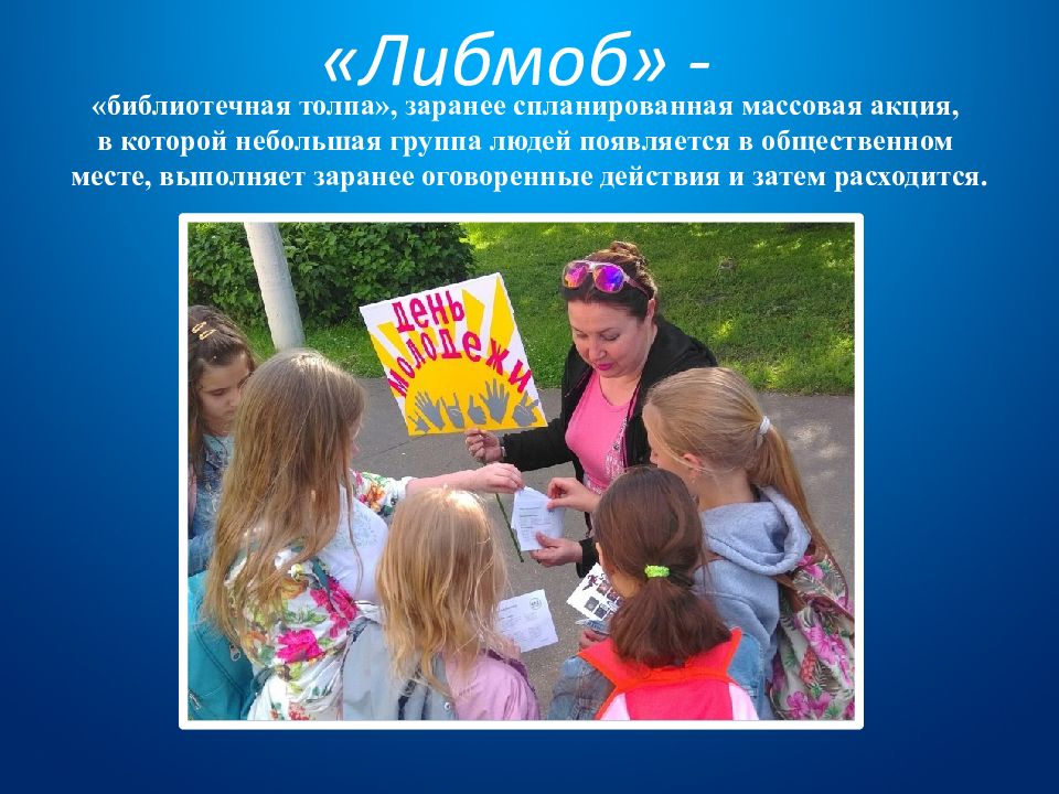 « Либмоб » - «библиотечная толпа», заранее спланированная массовая акция, в которой небольшая группа людей появляется в общественном месте, выполняет заранее оговоренные действия и затем расходится.