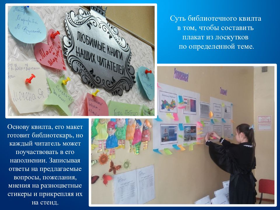 Суть библиотечного квилта в том, чтобы составить плакат из лоскутков по определенной теме. Основу квилта, его макет готовит библиотекарь, но каждый читатель может поучаствовать в его наполнении. Записывая ответы на предлагаемые вопросы, пожелания, мнения на разноцветные стикеры и прикрепляя их на стенд.
