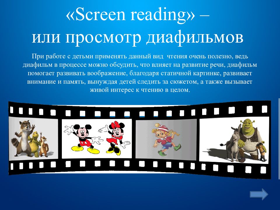 « Screen reading » – или просмотр диафильмов При работе с детьми применять данный вид чтения очень полезно, ведь диафильм в процессе можно обсудить, что влияет на развитие речи, диафильм помогает развивать воображение, благодаря статичной картинке, развивает внимание и память, вынуждая детей следить за сюжетом, а также вызывает живой интерес к чтению в целом.