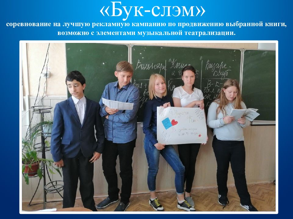« Бук-слэм » соревнование на лучшую рекламную кампанию по продвижению выбранной книги, возможно с элементами музыкальной театрализации.