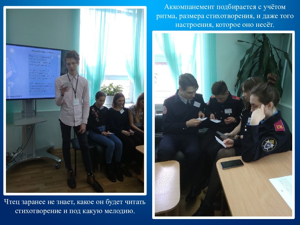 Аккомпанемент подбирается с учётом ритма, размера стихотворения, и даже того настроения, которое оно несёт. Чтец заранее не знает, какое он будет читать стихотворение и под какую мелодию.