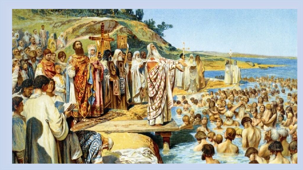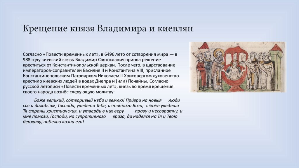 Согласно «Повести временных лет», в 6496 лето от сотворения мира — в 988 году киевский князь Владимир Святославич принял решение креститься от Константинопольской церкви. После чего, в царствование императоров-соправителей Василия II и Константина VIII, присланное Константинопольским Патриархом Николаем II Хрисовергом духовенство крестило киевских людей в водах Днепра и (или) Почайны. Согласно русской летописи «Повести временных лет», князь во время крещения своего народа вознёс следующую молитву: Боже великий, сотворивый небо и землю! При́зри на новыя люди сия и даждь им, Господи, уведети Тебе, истиннаго Бога, якоже уведеша Тя страны христианския, и утверди в них веру праву и несовратну, и мне помози, Господи, на супротивнаго врага, да надеяся на Тя и Твою державу, побежю козни его!