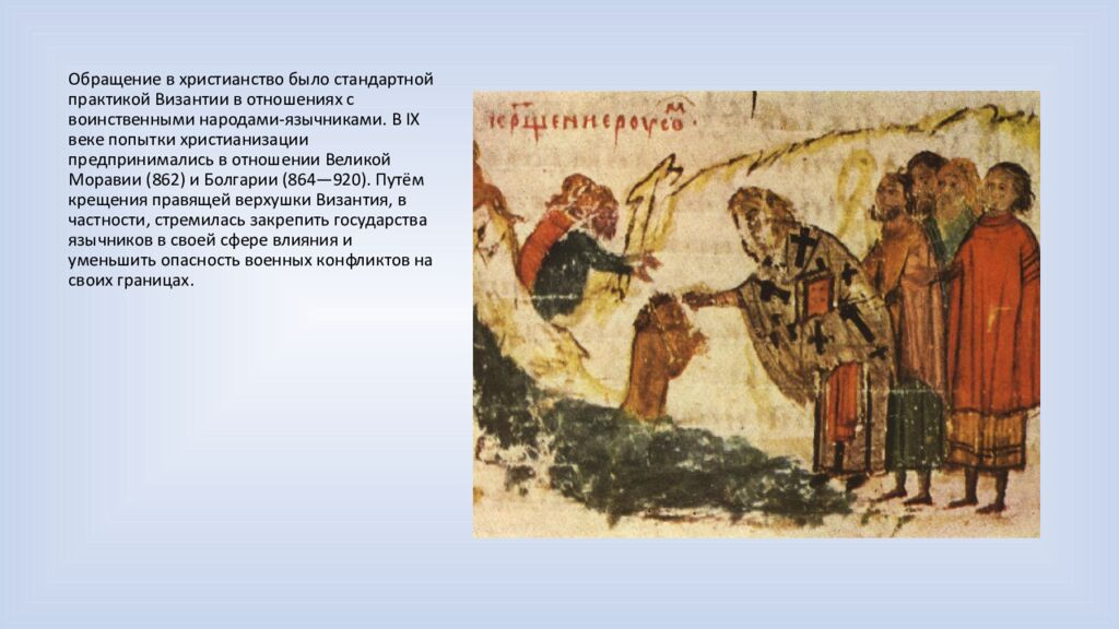 Обращение в христианство было стандартной практикой Византии в отношениях с воинственными народами-язычниками. В IX веке попытки христианизации предпринимались в отношении Великой Моравии (862) и Болгарии (864—920). Путём крещения правящей верхушки Византия, в частности, стремилась закрепить государства язычников в своей сфере влияния и уменьшить опасность военных конфликтов на своих границах.