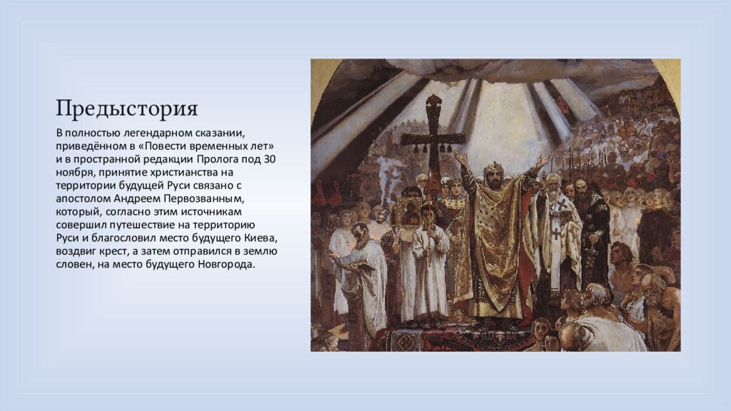 В полностью легендарном сказании, приведённом в «Повести временных лет» и в пространной редакции Пролога под 30 ноября, принятие христианства на территории будущей Руси связано с апостолом Андреем Первозванным, который, согласно этим источникам совершил путешествие на территорию Руси и благословил место будущего Киева, воздвиг крест, а затем отправился в землю словен, на место будущего Новгорода.