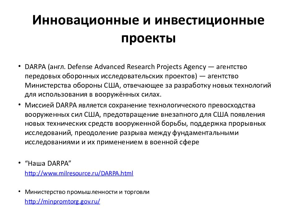 D ARPA (англ. Defense Advanced Research Projects Agency — агентство передовых оборонных исследовательских проектов) — агентство Министерства обороны США, отвечающее за разработку новых технологий для использования в вооружённых силах. Миссией DARPA является сохранение технологического превосходства вооруженных сил США, предотвращение внезапного для США появления новых технических средств вооруженной борьбы, поддержка прорывных исследований, преодоление разрыва между фундаментальными исследованиями и их применением в военной сфере “ Наша DARPA” http :// www.milresource.ru/DARPA.html Министерство промышленности и торговли http://minpromtorg.gov.ru /