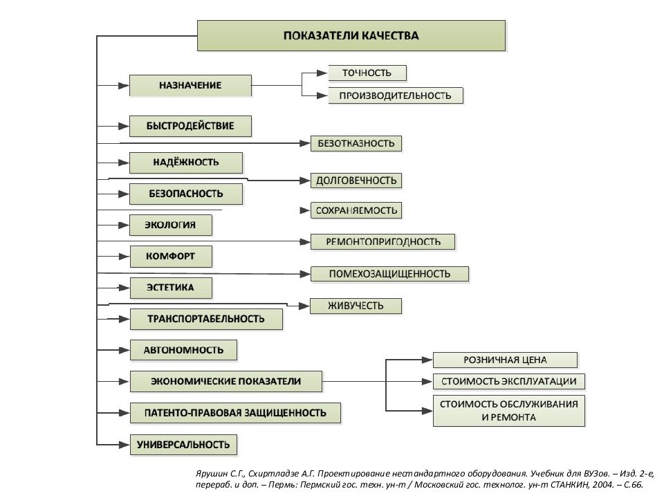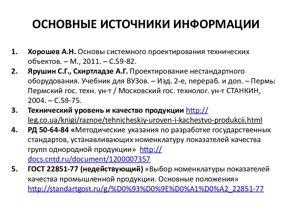 Хорошев А.Н. Основы системного проектирования технических объектов. – М., 2011. – С.59-82. Ярушин С.Г., Схиртладзе А.Г. Проектирование нестандартного оборудования. Учебник для ВУЗов. – Изд. 2-е, перераб. и доп. – Пермь: Пермский гос. техн. ун-т / Московский гос. технолог. ун-т СТАНКИН, 2004. – С.59-75. Технический уровень и качество продукции http :// leg.co.ua/knigi/raznoe/tehnicheskiy-uroven-i-kachestvo-produkcii.html РД 50-64-84 « Методические указания по разработке государственных стандартов, устанавливающих номенклатуру показателей качества групп однородной продукции» http :// docs.cntd.ru/document/1200007357 ГОСТ 22851-77 (недействующий) «Выбор номенклатуры показателей качества промышленной продукции. Основные положения» http://standartgost.ru/g/% D0%93%D0%9E%D0%A1%D0%A2_22851-77 ОСНОВНЫЕ ИСТОЧНИКИ ИНФОРМАЦИИ