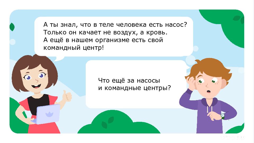 А ты знал, что в теле человека есть насос? Только он качает не воздух, а кровь. А ещё в нашем организме есть свой командный центр! Что ещё за насосы и командные центры?