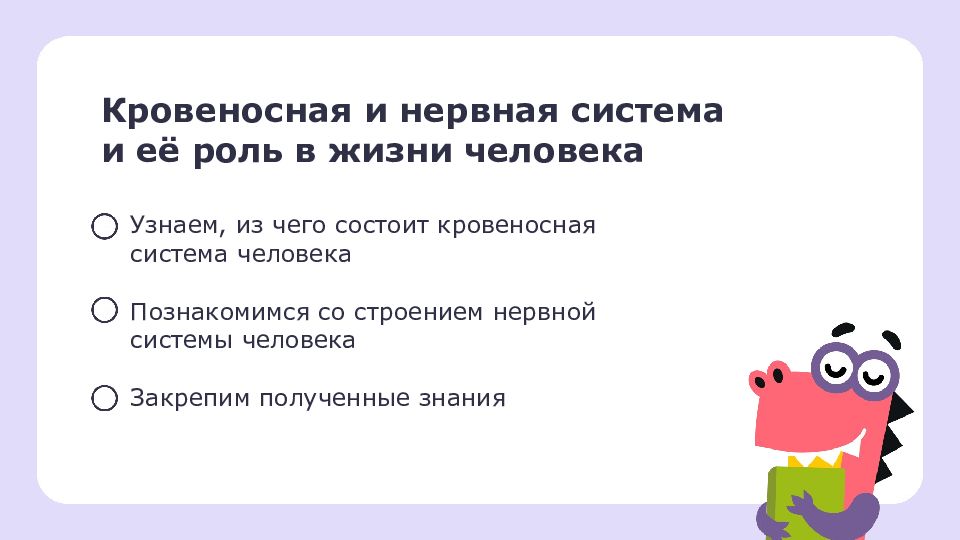 Кровеносная и нервная система и её роль в жизни человека Узнаем, из чего состоит кровеносная система человека Познакомимся со строением нервной системы человека Закрепим полученные знания