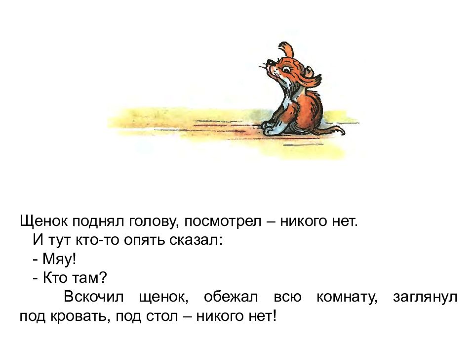 Щенок поднял голову, посмотрел – никого нет. И тут кто-то опять сказал: - Мяу! - Кто там? Вскочил щенок, обежал всю комнату, заглянул под кровать, под стол – никого нет!