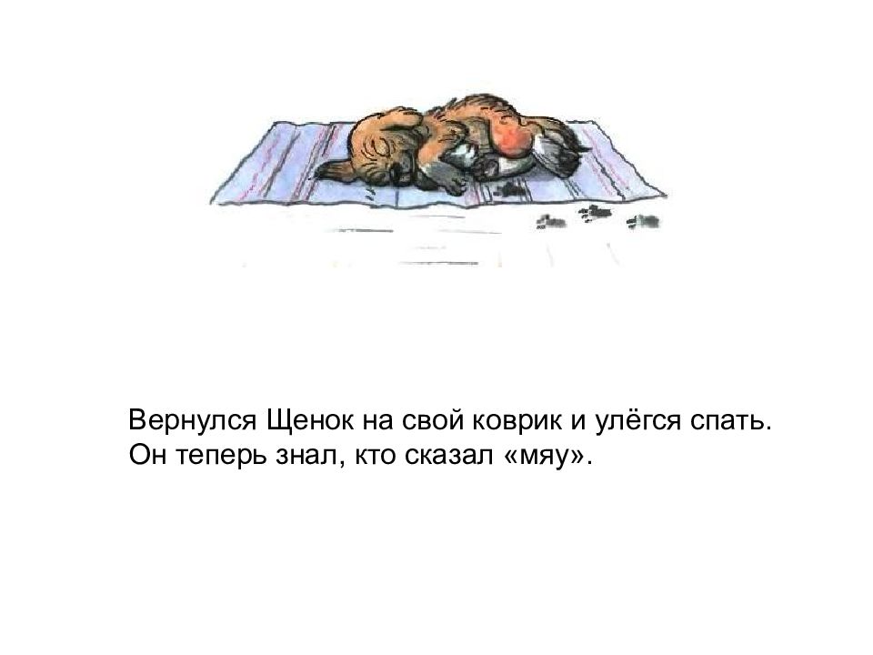 Щенок спал на коврике около дивана. Вдруг сквозь сон он услышал, как кто-то сказал: - Мяу!