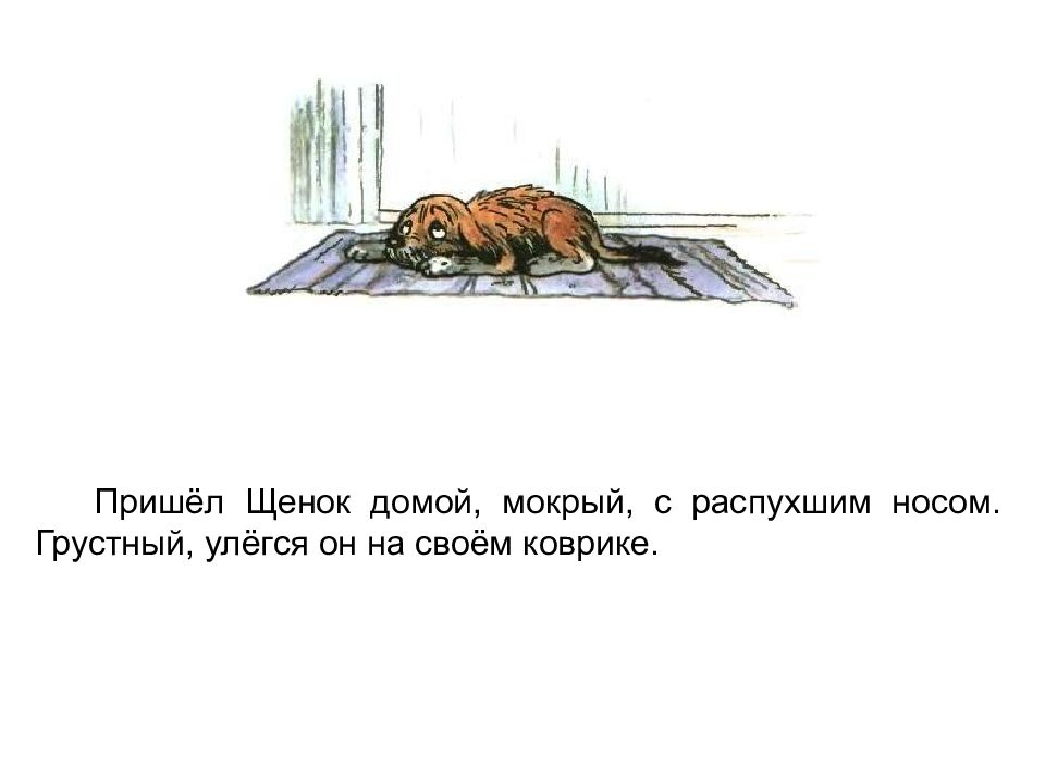 Пришёл Щенок домой, мокрый, с распухшим носом. Грустный, улёгся он на своём коврике.