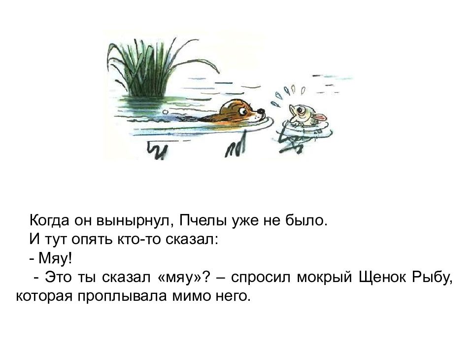 Когда он вынырнул, Пчелы уже не было. И тут опять кто-то сказал: - Мяу! - Это ты сказал «мяу»? – спросил мокрый Щенок Рыбу, которая проплывала мимо него.
