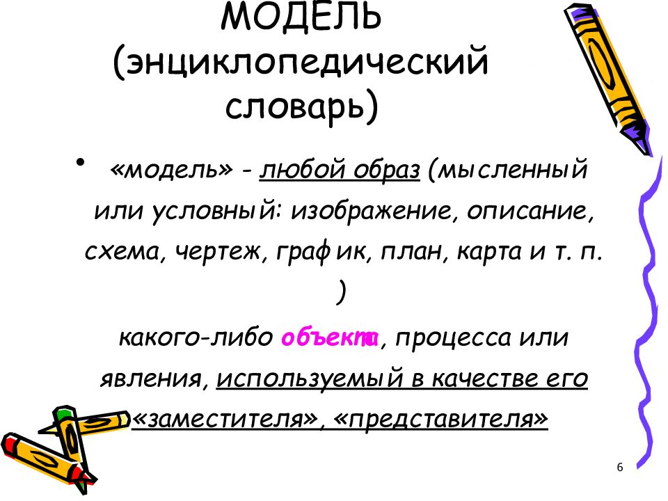 «модель» - любой образ (мысленный или условный: изображение, описание, схема, чертеж, график, план, карта и т. п. ) какого-либо объекта, процесса или явления, используемый в качестве его «заместителя», «представителя» 6