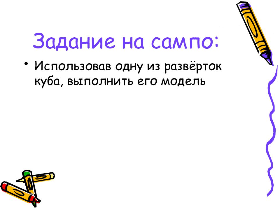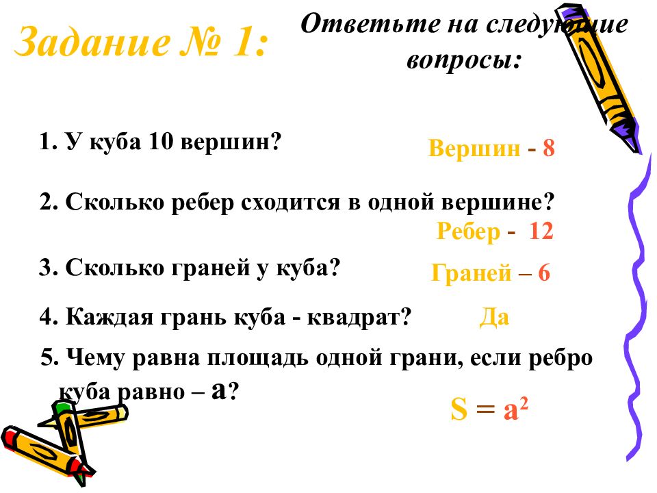 1. У куба 10 вершин? Ответьте на следующие вопросы : Вершин - 8 2. Сколько ребер сходится в одной вершине? Ребер - 12 3. Сколько граней у куба? Граней – 6 5. Чему равна площадь одной грани, если ребро куба равно – а ? S = a 2 Задание № 1: 4. Каждая грань куба - квадрат? Да