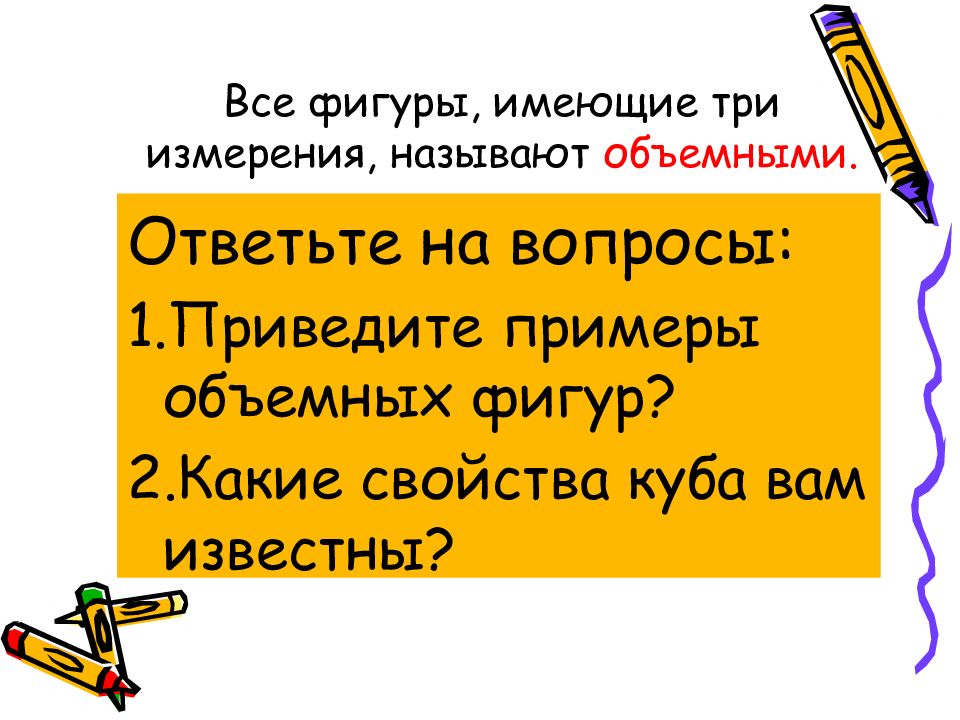 Ответьте на вопросы: 1.Приведите примеры объемных фигур? 2.Какие свойства куба вам известны?