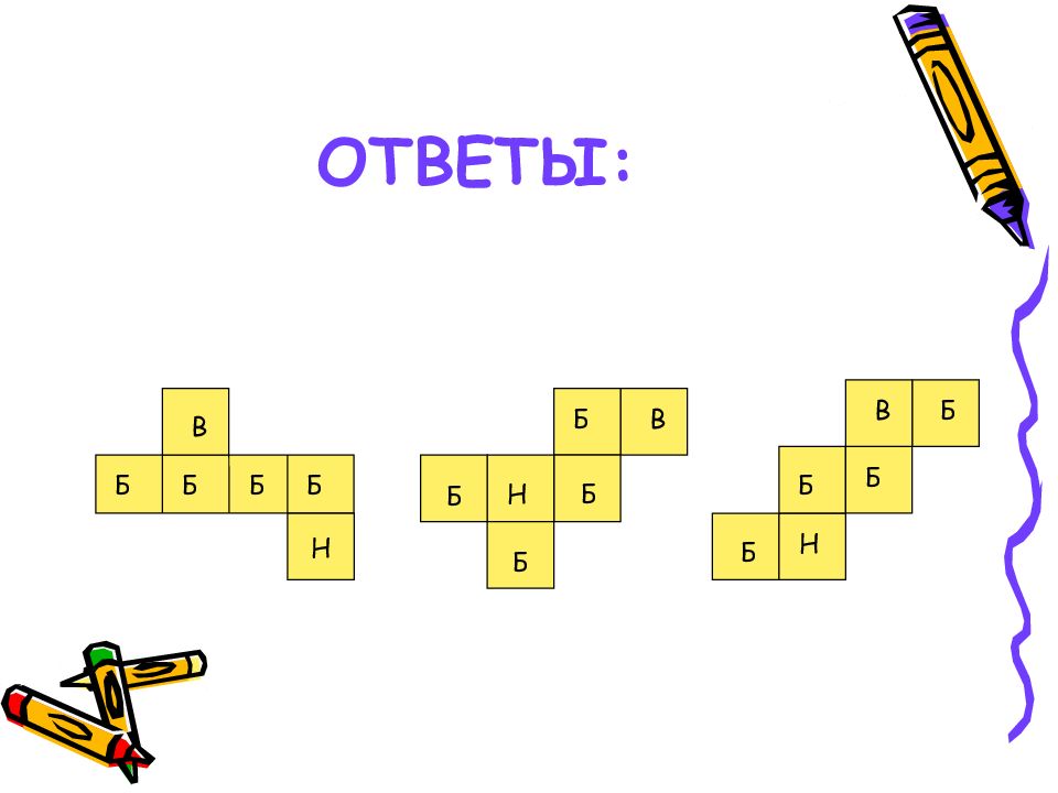 № 4 Условимся боковые грани куба обозначать буквой Б, верхнюю- В, нижнюю- Н. Расставьте на развертках куба буквы в соответствии с уже намеченными. Б Б Б Н Н В