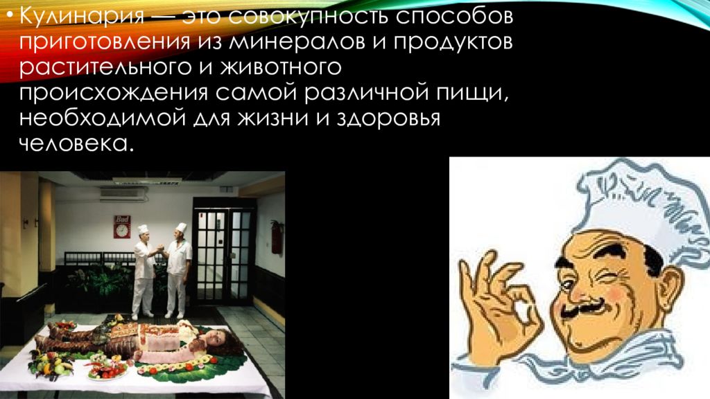 Кулинария — это совокупность способов приготовления из минералов и продуктов растительного и животного происхождения самой различной пищи, необходимой для жизни и здоровья человека.