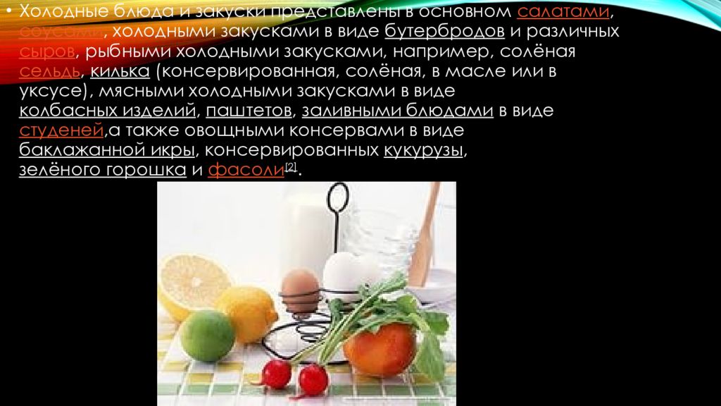 Холодные блюда и закуски представлены в основном салатами, соусами, холодными закусками в виде бутербродов и различных сыров, рыбными холодными закусками, например, солёная сельдь, килька (консервированная, солёная, в масле или в уксусе), мясными холодными закусками в виде колбасных изделий, паштетов, заливными блюдами в виде студеней, а также овощными консервами в виде баклажанной икры, консервированных кукурузы, зелёного горошка и фасоли [2].