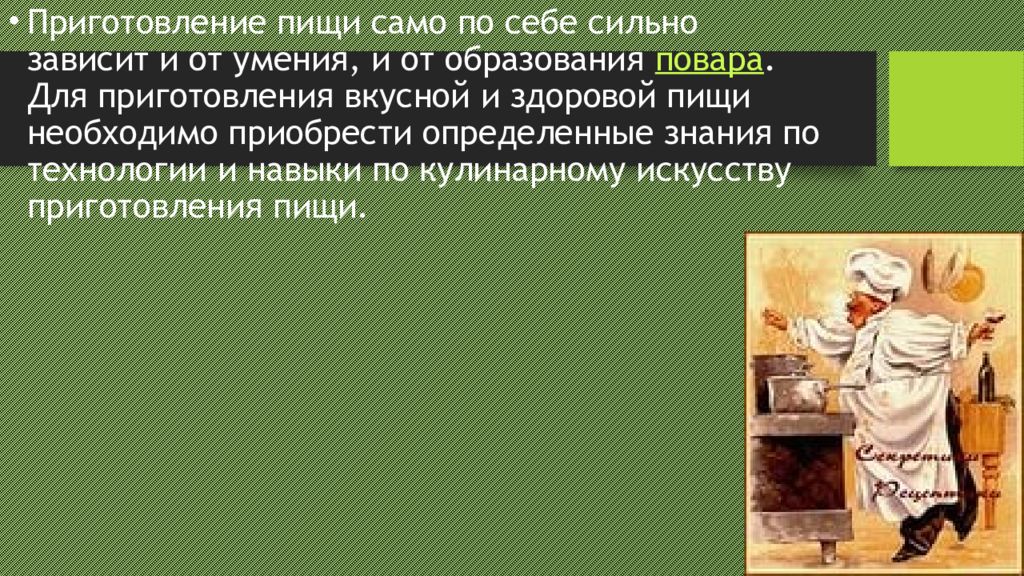Приготовление пищи само по себе сильно зависит и от умения, и от образования повара. Для приготовления вкусной и здоровой пищи необходимо приобрести определенные знания по технологии и навыки по кулинарному искусству приготовления пищи.