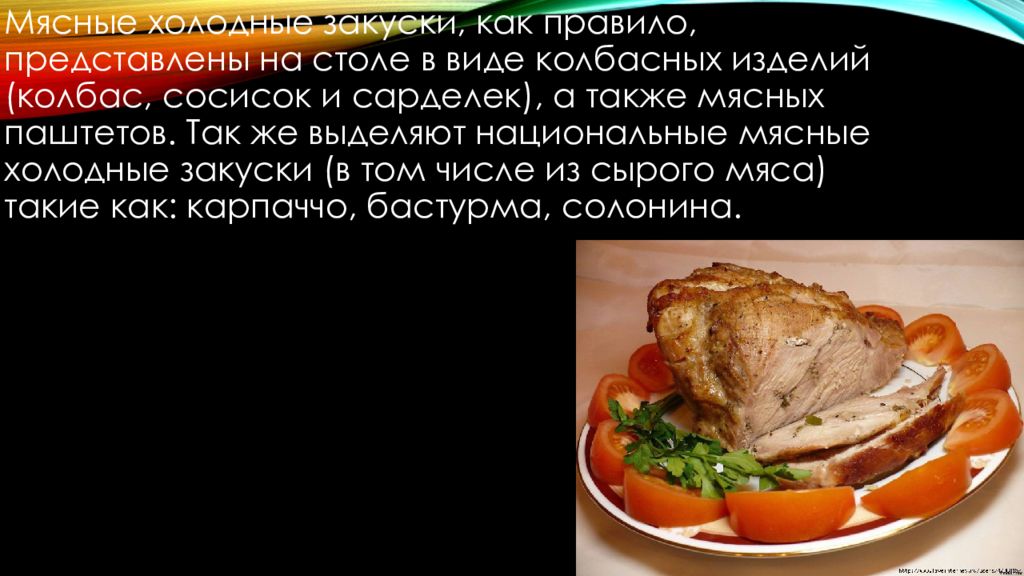 Мясные холодные закуски, как правило, представлены на столе в виде колбасных изделий (колбас, сосисок и сарделек), а также мясных паштетов. Так же выделяют национальные мясные холодные закуски (в том числе из сырого мяса) такие как: карпаччо, бастурма, солонина.
