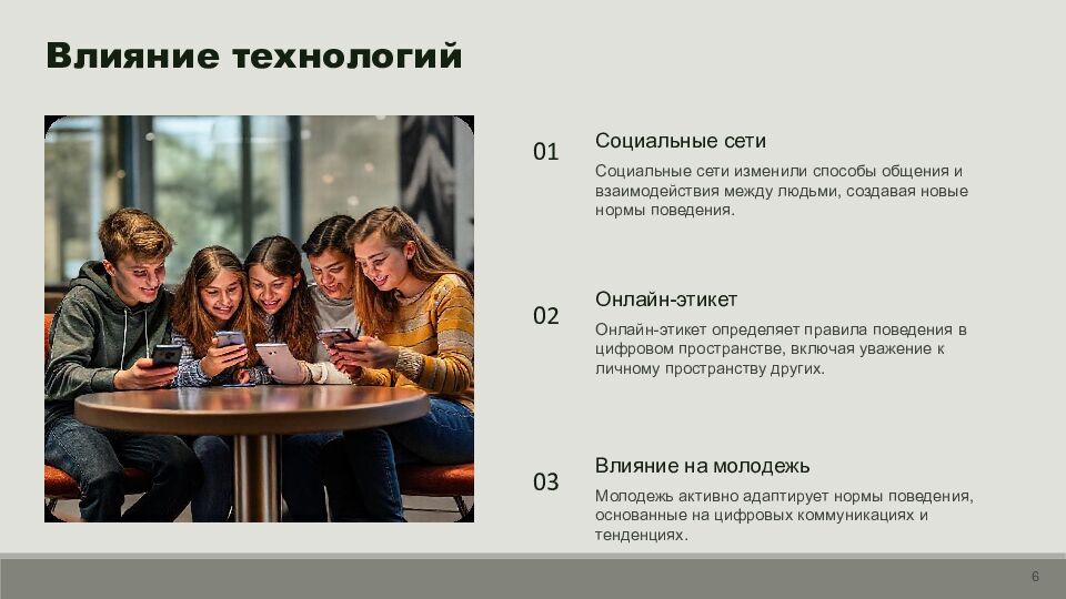 01 02 03 Социальные сети Социальные сети изменили способы общения и взаимодействия между людьми, создавая новые нормы поведения. Онлайн-этикет Онлайн-этикет определяет правила поведения в цифровом пространстве, включая уважение к личному пространству других. Влияние на молодежь Молодежь активно адаптирует нормы поведения, основанные на цифровых коммуникациях и тенденциях. 6 Влияние технологий