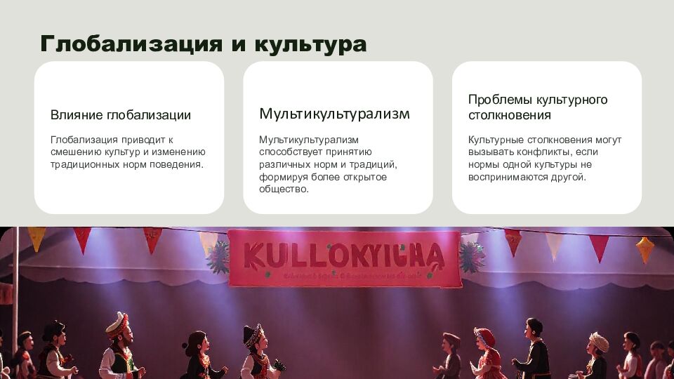 Влияние глобализации Глобализация приводит к смешению культур и изменению традиционных норм поведения. Мультикультурализм Мультикультурализм способствует принятию различных норм и традиций, формируя более открытое общество. Проблемы культурного столкновения Культурные столкновения могут вызывать конфликты, если нормы одной культуры не воспринимаются другой. 7 Глобализация и культура