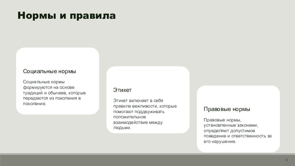 Социальные нормы Социальные нормы формируются на основе традиций и обычаев, которые передаются из поколения в поколение. Этикет Этикет включает в себя правила вежливости, которые помогают поддерживать положительное взаимодействие между людьми. Правовые нормы Правовые нормы, установленные законами, определяют допустимое поведение и ответственность за его нарушение. 3 Нормы и правила