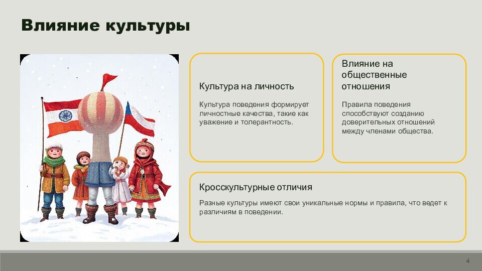 Культура на личность Культура поведения формирует личностные качества, такие как уважение и толерантность. Влияние на общественные отношения Правила поведения способствуют созданию доверительных отношений между членами общества. Кросскультурные отличия Разные культуры имеют свои уникальные нормы и правила, что ведет к различиям в поведении. 4 Влияние культуры