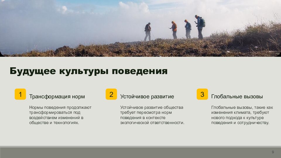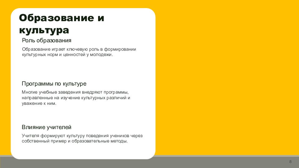 Роль образования Образование играет ключевую роль в формировании культурных норм и ценностей у молодежи. Программы по культуре Многие учебные заведения внедряют программы, направленные на изучение культурных различий и уважение к ним. Влияние учителей Учителя формируют культуру поведения учеников через собственный пример и образовательные методы. 8 Образование и культура