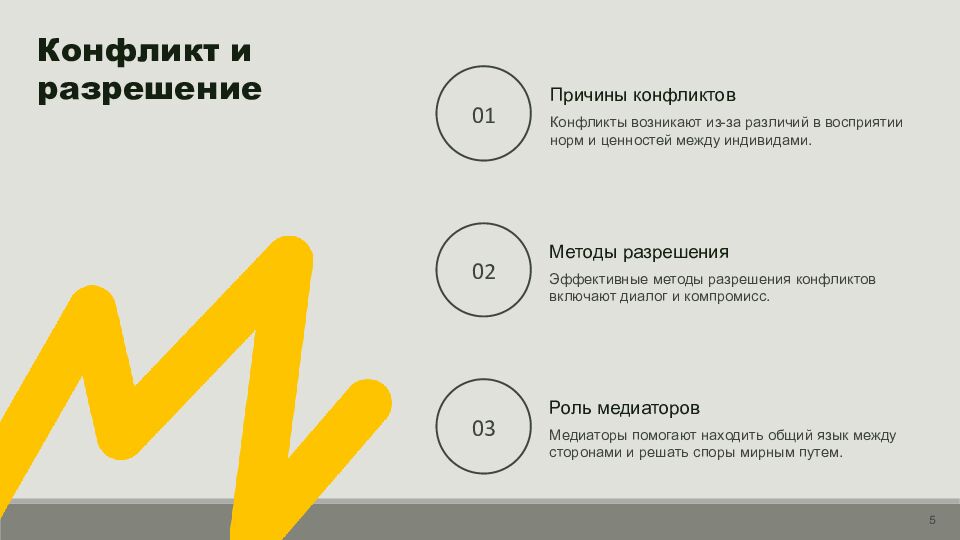 01 02 03 Причины конфликтов Конфликты возникают из-за различий в восприятии норм и ценностей между индивидами. Методы разрешения Эффективные методы разрешения конфликтов включают диалог и компромисс. Роль медиаторов Медиаторы помогают находить общий язык между сторонами и решать споры мирным путем. 5 Конфликт и разрешение