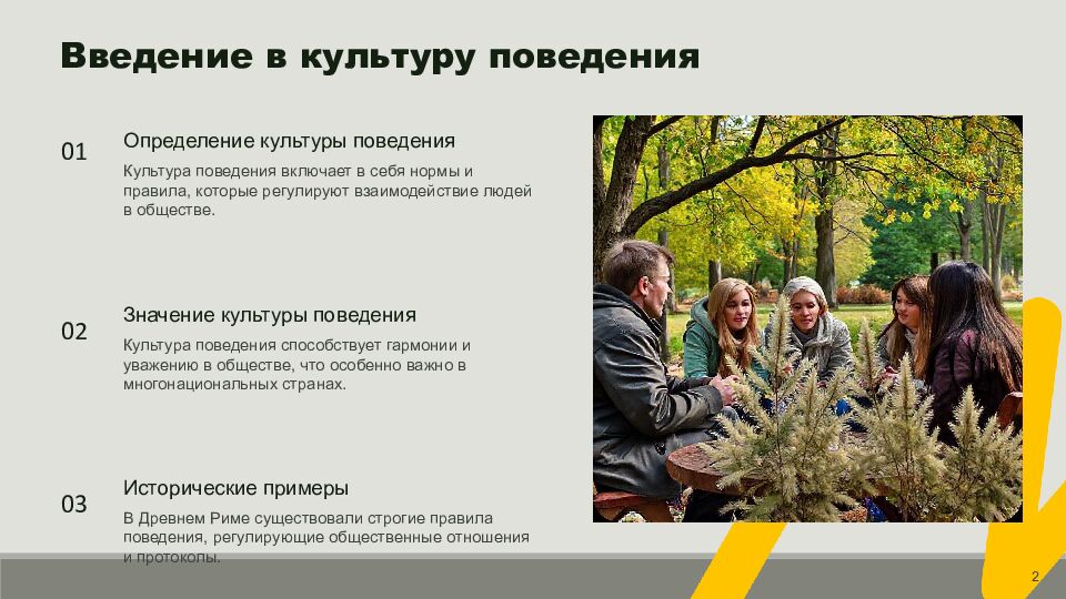 01 02 03 Определение культуры поведения Культура поведения включает в себя нормы и правила, которые регулируют взаимодействие людей в обществе. Значение культуры поведения Культура поведения способствует гармонии и уважению в обществе, что особенно важно в многонациональных странах. Исторические примеры В Древнем Риме существовали строгие правила поведения, регулирующие общественные отношения и протоколы. 2 Введение в культуру поведения