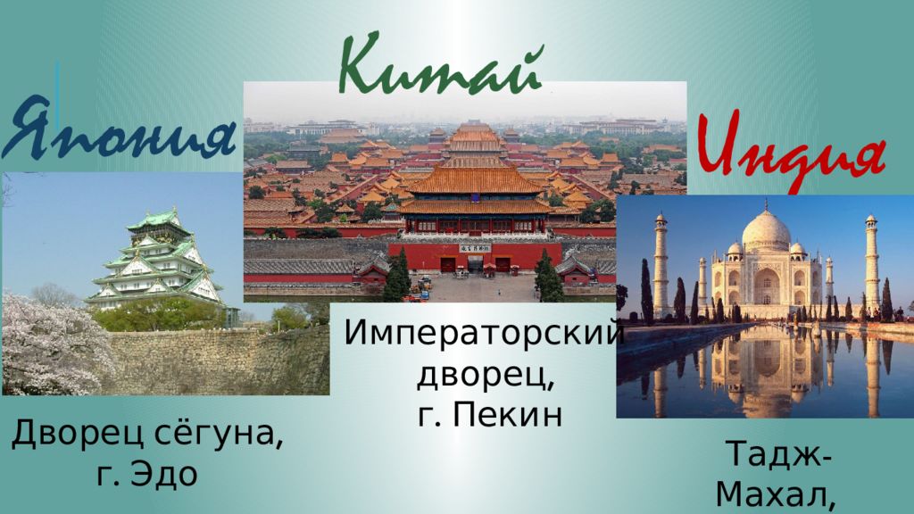 Индия Япония Китай Дворец сёгуна, г. Эдо Императорский д ворец, г. Пекин Тадж-Махал, г. Агра