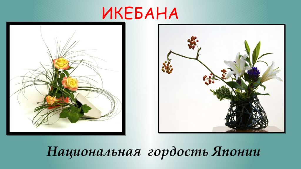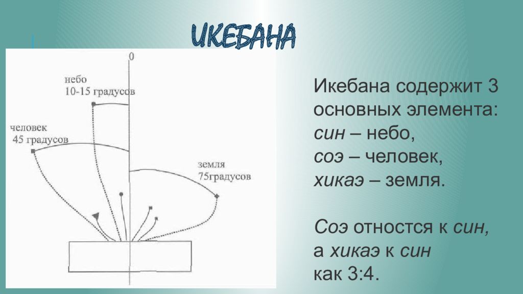 Икебана содержит 3 основных элемента: син – небо, соэ – человек, хикаэ – земля. Соэ отностся к син, а хикаэ к син как 3:4. ИКЕБАНА