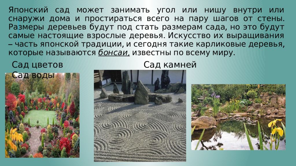 Японский сад может занимать угол или нишу внутри или снаружи дома и простираться всего на пару шагов от стены. Размеры деревьев будут под стать размерам сада, но это будут самые настоящие взрослые деревья. Искусство их выращивания – часть японской традиции, и сегодня такие карликовые деревья, которые называются бонсаи, известны по всему миру. Сад цветов Сад камней Сад воды