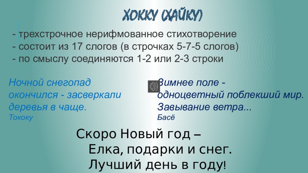 ХОККУ (ХАЙКУ) - трехстрочное нерифмованное стихотворение - состоит из 17 слогов (в строчках 5-7-5 слогов) - по смыслу соединяются 1-2 или 2-3 строки Ночной снегопад окончился - засверкали деревья в чаще. Тококу Зимнее поле - одноцветный поблекший мир. Завывание ветра... Басё Скоро Новый год – Елка, подарки и снег. Лучший день в году!