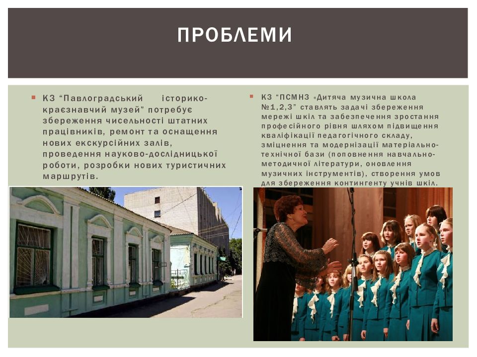 КЗ “ Павлоградський історико-краєзнавчий музей” потребує збереження чисельності штатних працівників, ремонт та оснащення нових екскурсійних залів, проведення науково-дослідницької роботи, розробки нових туристичних маршрутів. КЗ “ПСМНЗ « Дитяча музична школа №1,2,3” ставлять задачі збереження мережі шкіл та забезпечення зростання професійного рівня шляхом підвищення кваліфікації педагогічного складу, зміцнення та модернізації матеріально-технічної бази ( поповнення навчально-методичної літератури, оновлення музичних інструментів ), створення умов для збереження контингенту учнів шкіл. Проблеми