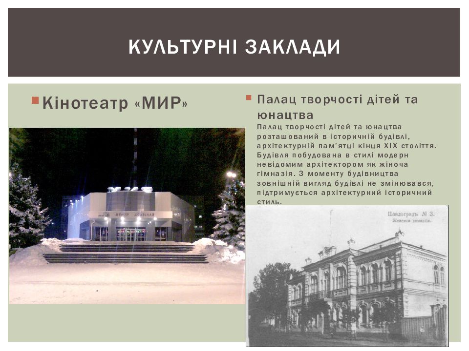 Кінотеатр «МИР» Палац творчості дітей та юнацтва Палац творчості дітей та юнацтва розташований в історичній будівлі, архітектурній пам’ятці кінця XIX століття. Будівля побудована в стилі модерн невідомим архітектором як жіноча гімназія. З моменту будівництва зовнішній вигляд будівлі не змінювався, підтримується архітектурний історичний стиль. Культурні заклади