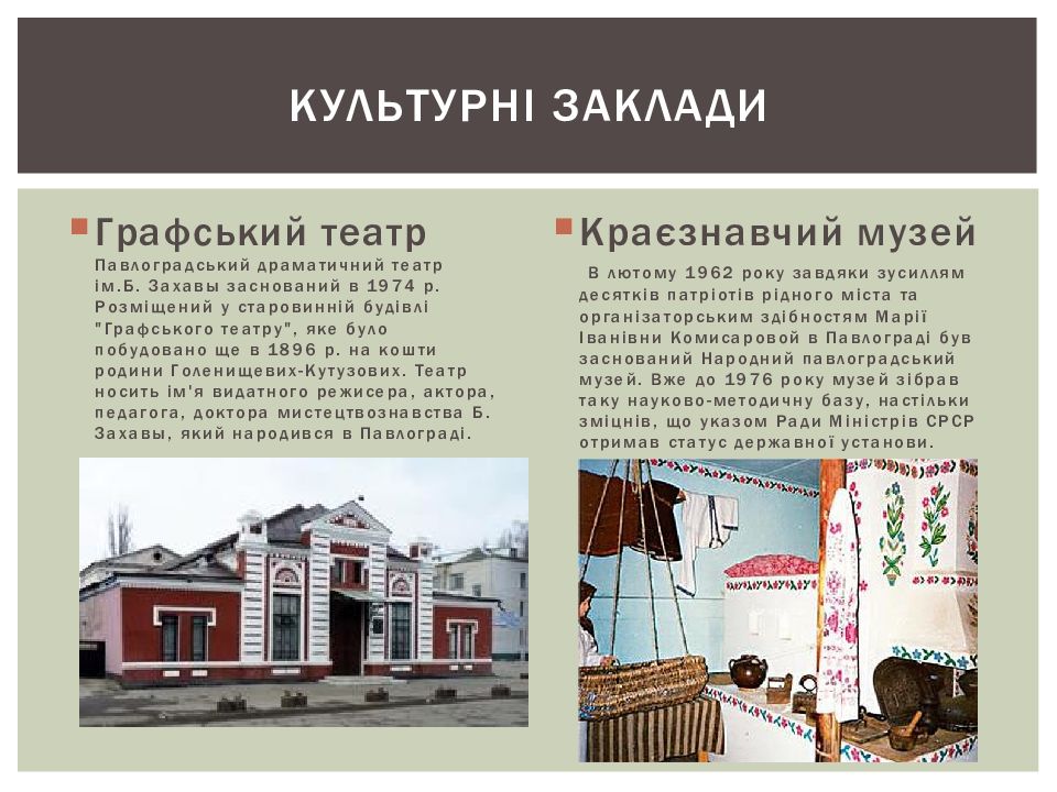 Графський театр Павлоградський драматичний театр ім.Б. Захавы заснований в 1974 р. Розміщений у старовинній будівлі " Графського театру", яке було побудовано ще в 1896 р. на кошти родини Голенищевих-Кутузових. Театр носить ім'я видатного режисера, актора, педагога, доктора мистецтвознавства Б. Захавы, який народився в Павлограді. Краєзнавчий музей В лютому 1962 року завдяки зусиллям десятків патріотів рідного міста та організаторським здібностям Марії Іванівни Комисаровой в Павлограді був заснований Народний павлоградський музей. Вже до 1976 року музей зібрав таку науково-методичну базу, настільки зміцнів, що указом Ради Міністрів СРСР отримав статус державної установи. Культурні заклади