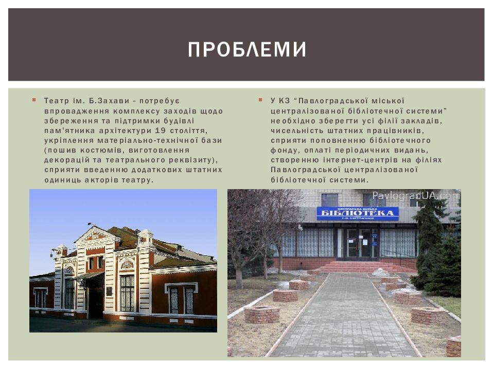 Театр ім. Б.Захави - потребує впровадження комплексу заходів щодо збереження та підтримки будівлі пам'ятника архітектури 19 століття, укріплення матеріально-технічної бази (пошив костюмів, виготовлення декорацій та театрального реквізиту ), сприяти введенню додаткових штатних одиниць акторів театру. У КЗ “ Павлоградської міської централізованої бібліотечної системи ” необхідно зберегти усі філії закладів, чисельність штатних працівників, сприяти поповненню бібліотечного фонду, оплаті періодичних видань, створенню інтернет-центрів на філіях Павлоградської централізованої бібліотечної системи. проблеми