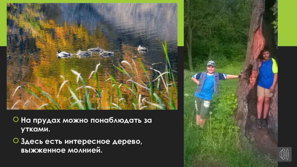 На прудах можно понаблюдать за утками. Здесь есть интересное дерево, выжженное молнией.