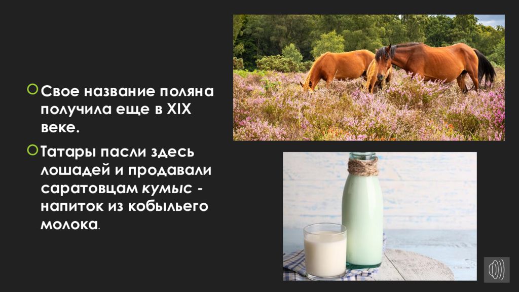 Свое название поляна получила еще в XIX веке. Татары пасли здесь лошадей и продавали саратовцам кумыс - напиток из кобыльего молока.