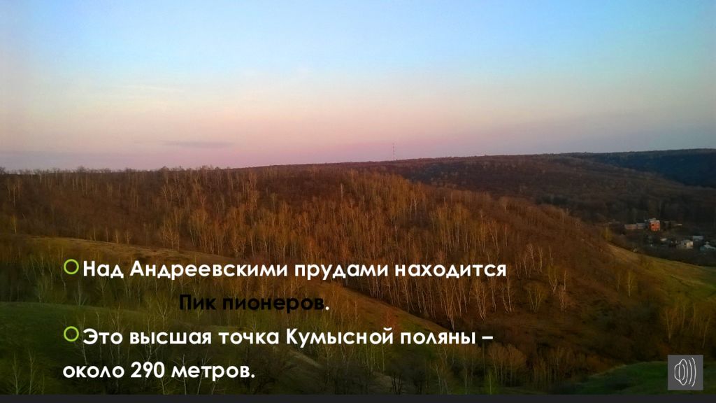 Над Андреевскими прудами находится Пик пионеров. Это высшая точка Кумысной поляны – около 290 метров.