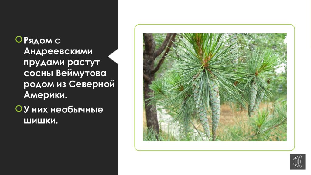 Рядом с Андреевскими прудами растут сосны Веймутова родом из Северной Америки. У них необычные шишки.